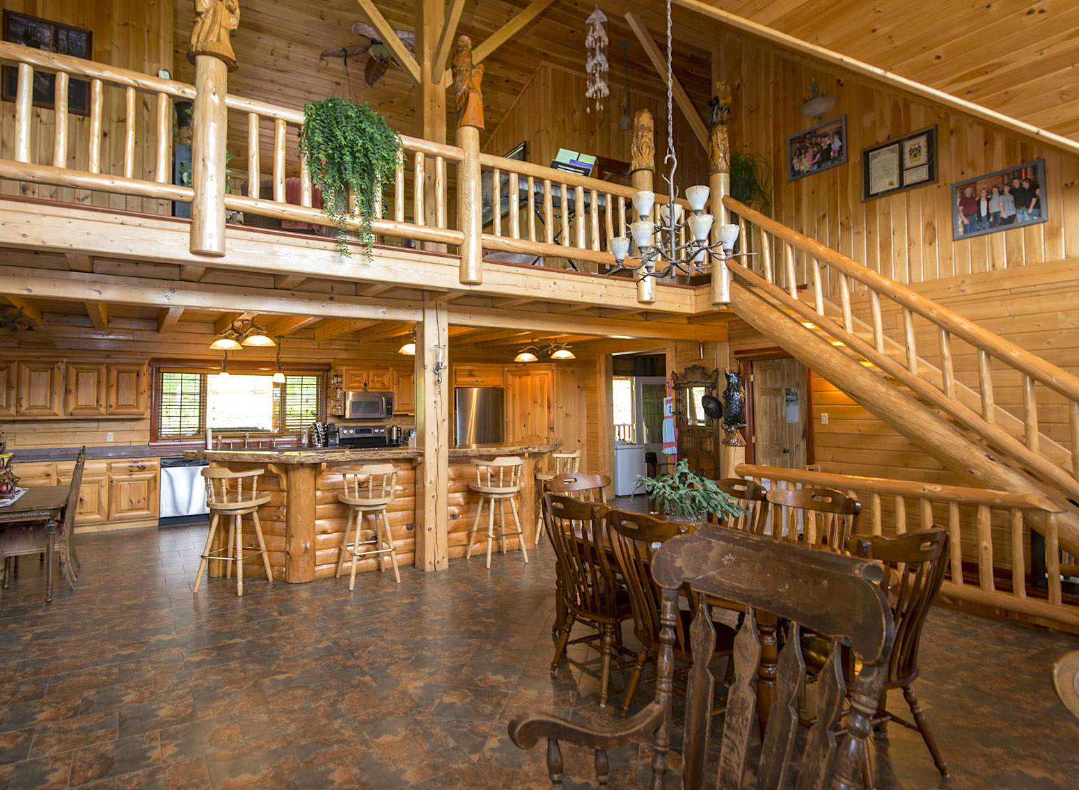 Inside you’ll see a stunning showcase of custom millwork and log cabin design that you rarely see anymore. Not to mention the bespoke work done on the top railing where you can see more than a few faces and animals carved out. Sadly, I couldn’t find a closer up picture of them but as you can from the featured image, these carvings add to the charm of this log cabin in a big way.